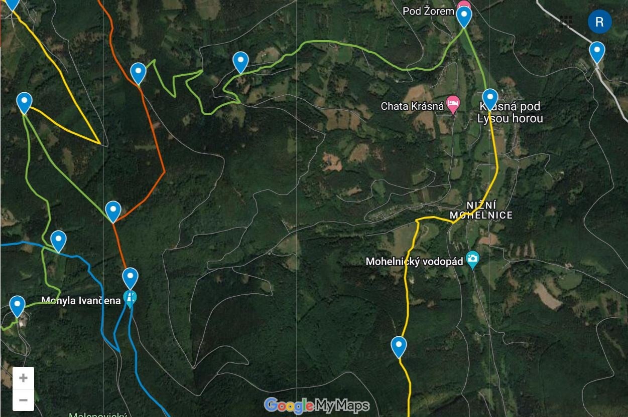 Startpunkt Krasna pod Lysou horou oder Nizni Mohelnice – gelber Wanderweg hoch zur Lysa hora (ca. 7 km von Krasna aus)