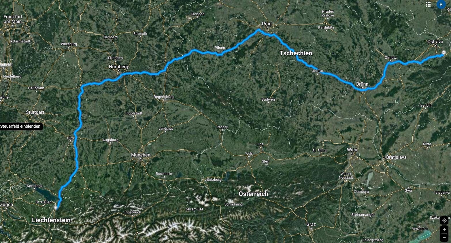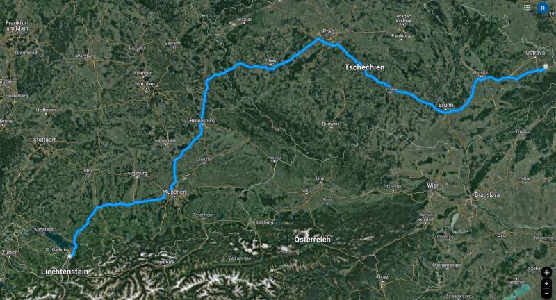 Route: Diepoldsau – Hohenems – Lindau – Memmingen – München – Regensburg – Rozvadov – Praha – Brno – Olomouc – Frydek-Mistek – Lucina